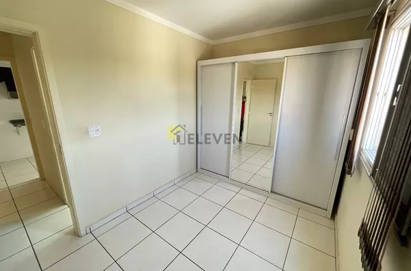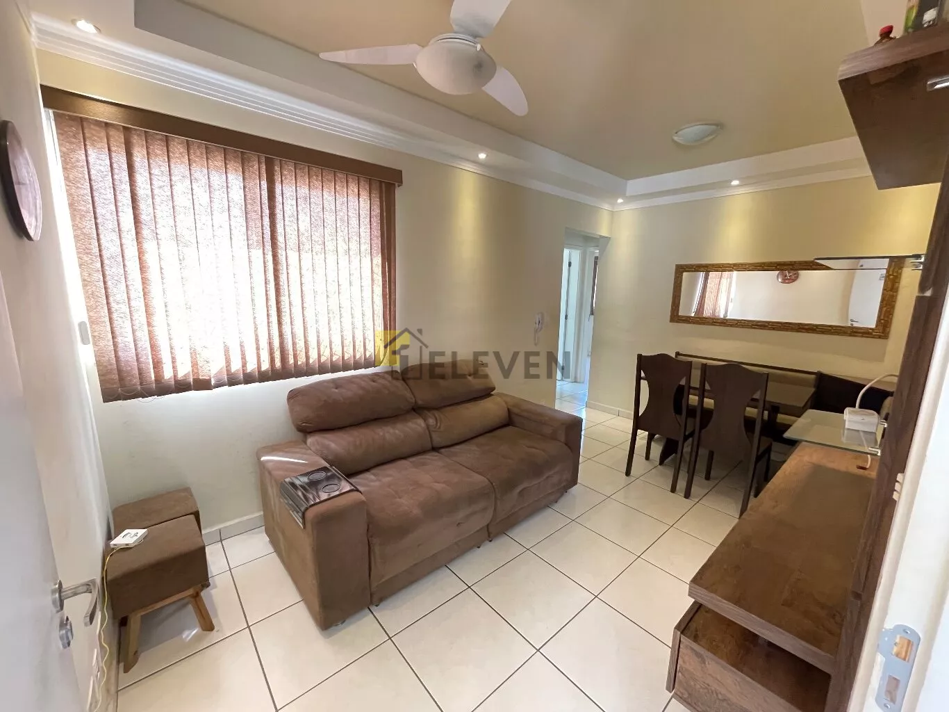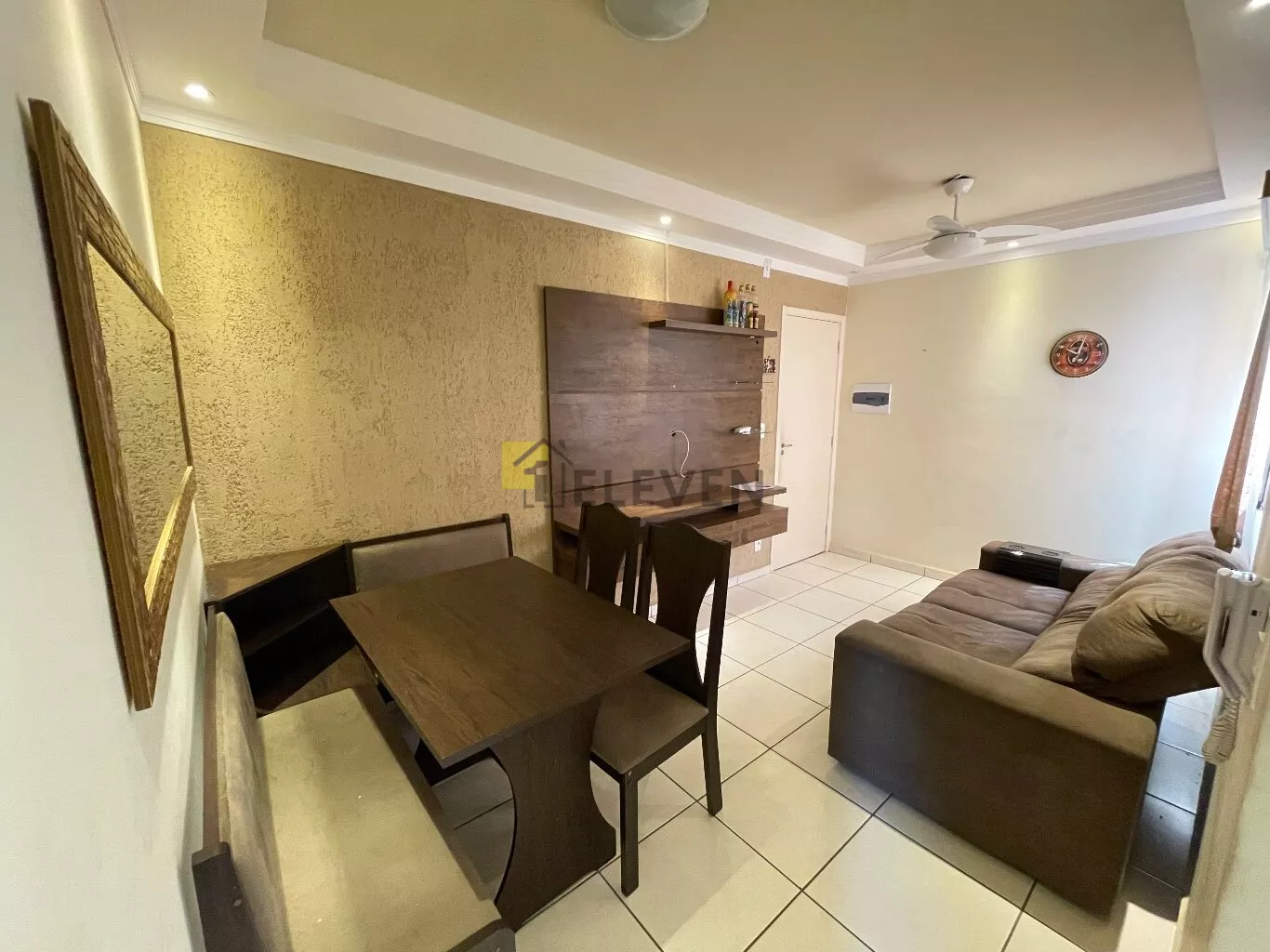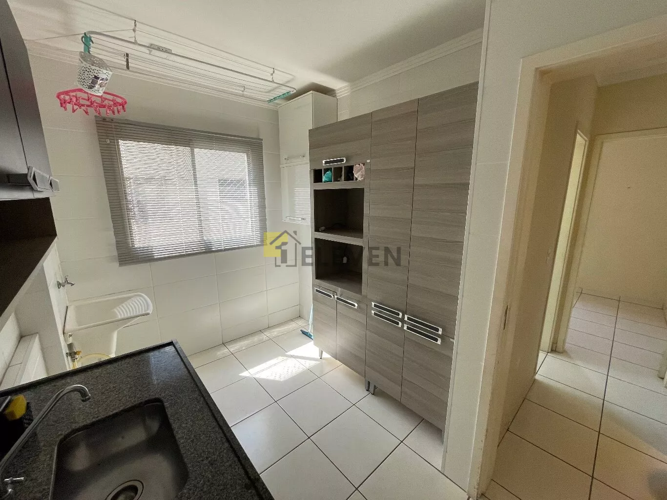 🛌 2 dormitórios, ambos com armários e um com cama🛋️ sala com sofá, painel e mesa🍽 cozinha com armários🧺 lavanderia🚽 wc social🚗 vaga de garagem