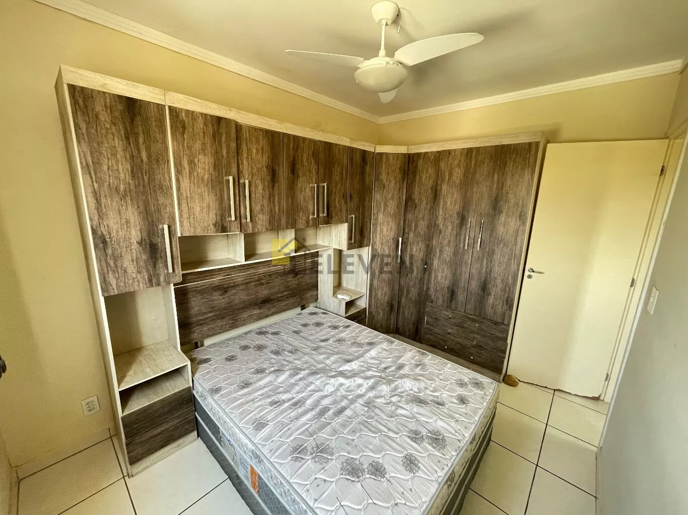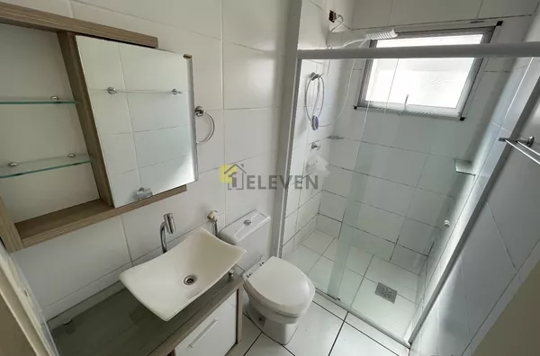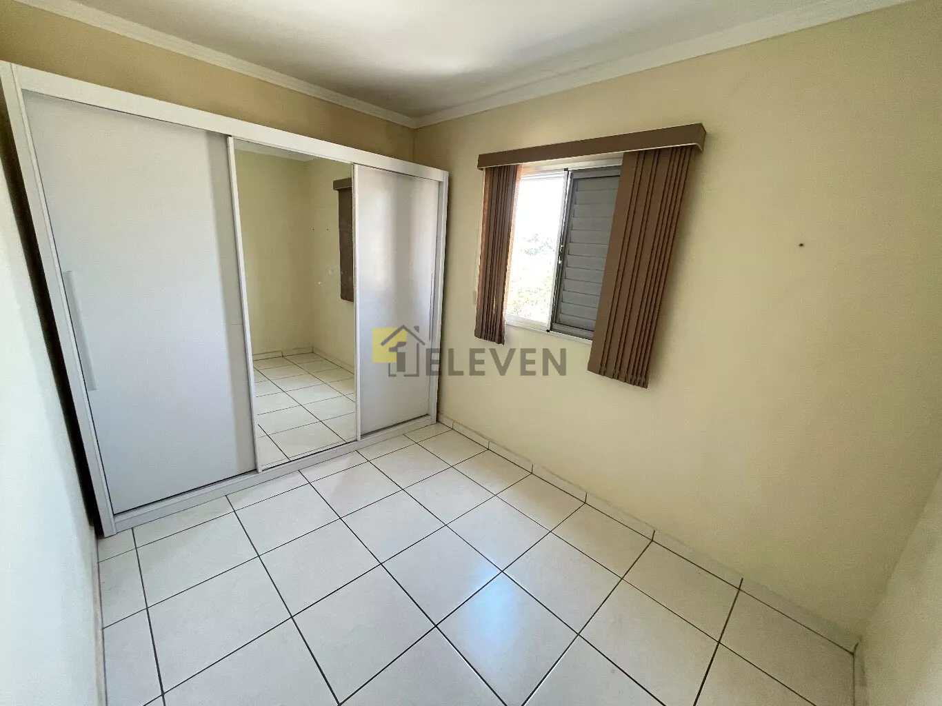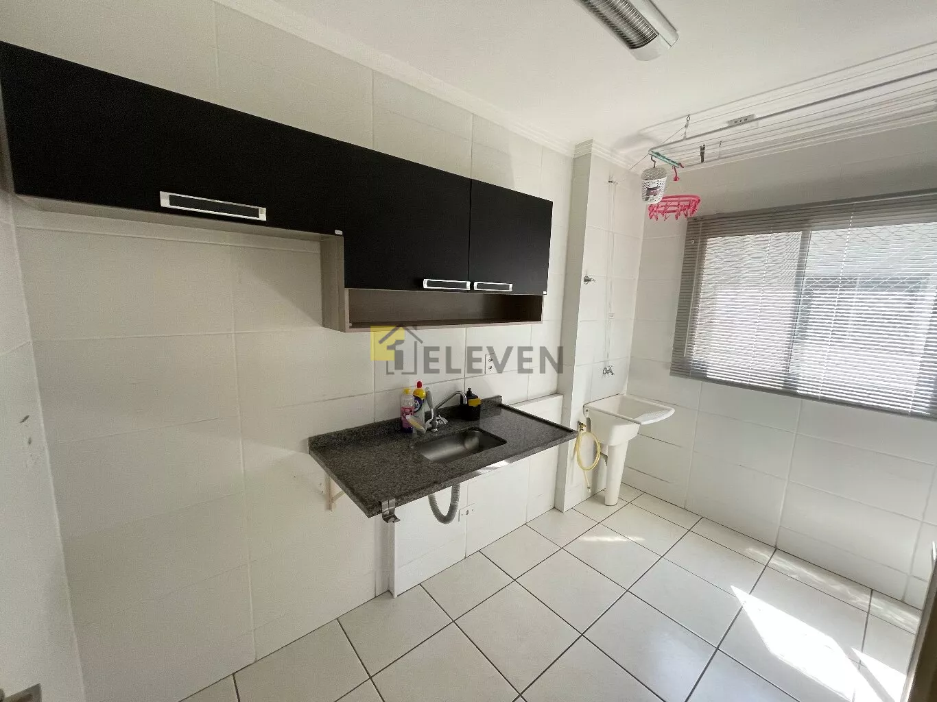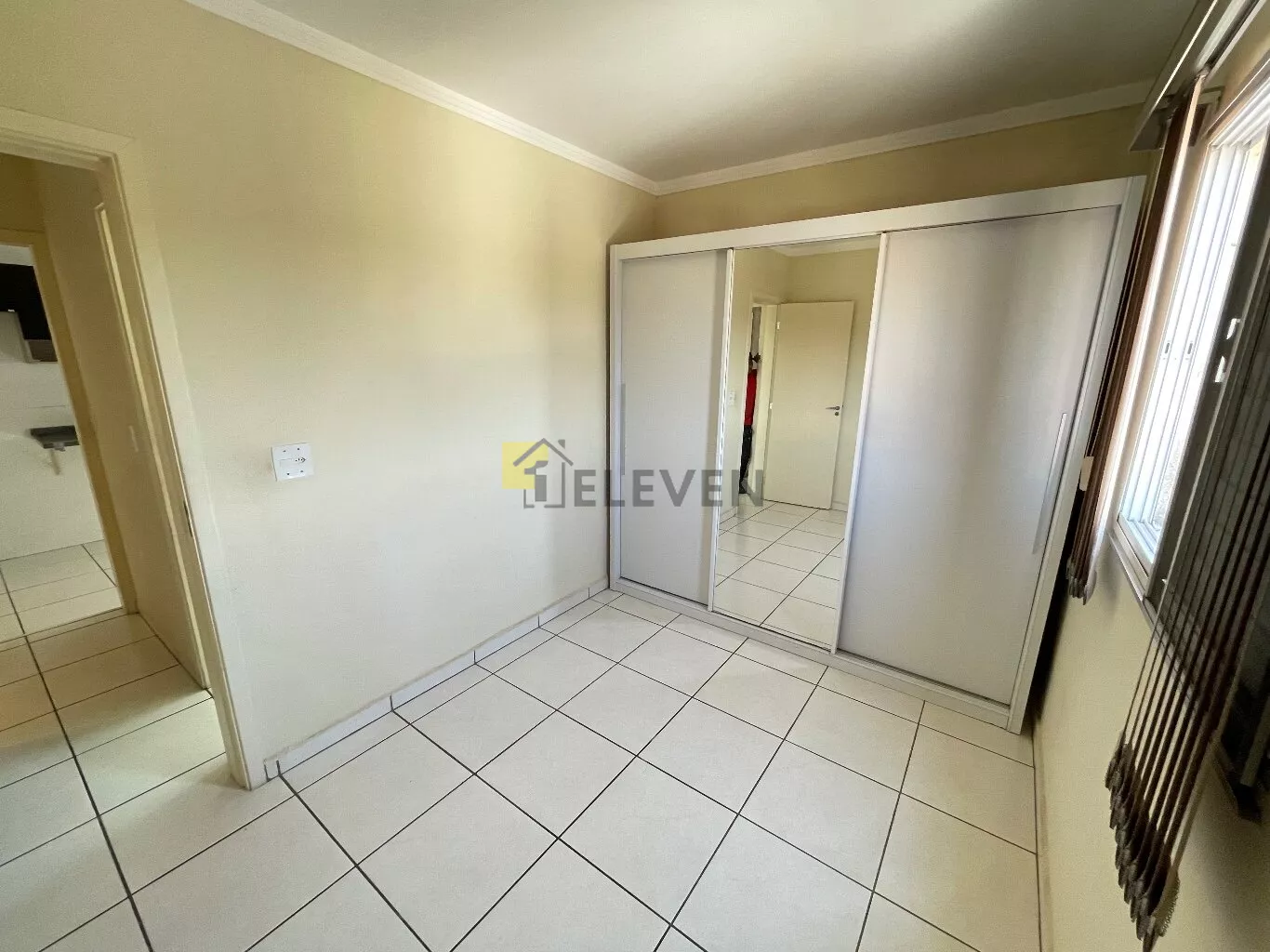 🛌 2 dormitórios, ambos com armários e um com cama🛋️ sala com sofá, painel e mesa🍽 cozinha com armários🧺 lavanderia🚽 wc social🚗 vaga de garagem