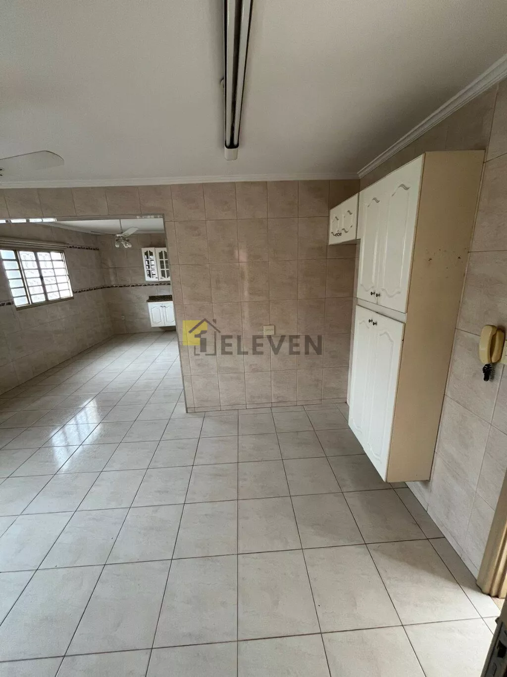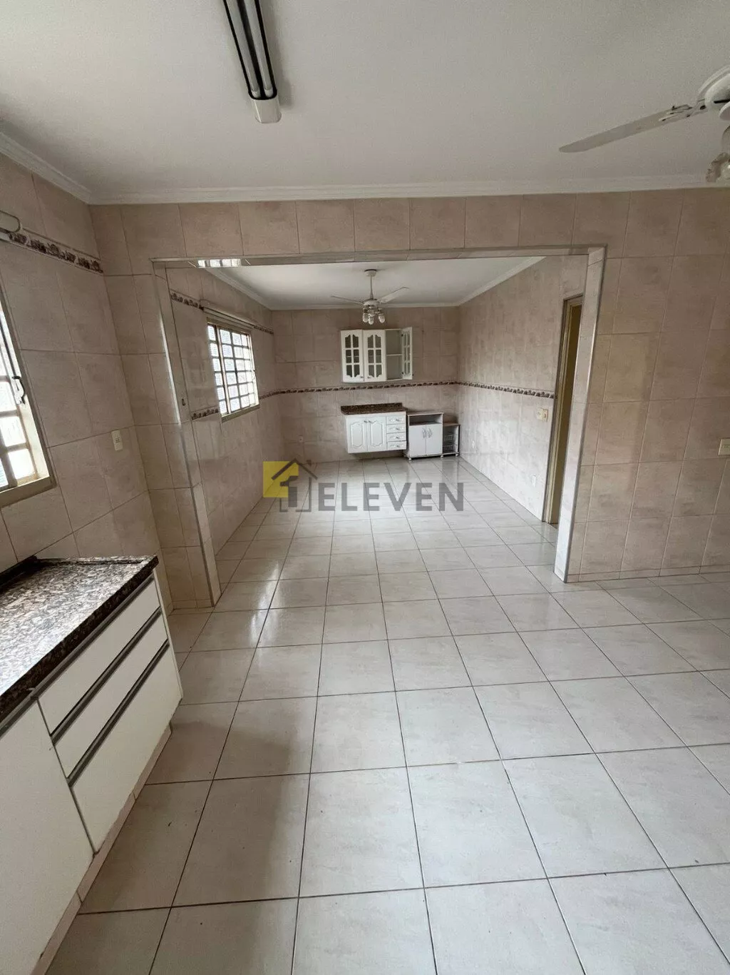 cozinha com 2 ambientes e 2 ventiladores de teto